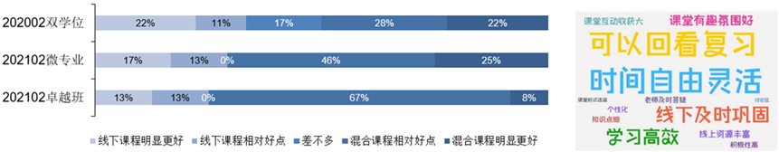 授课过程中学生反馈效果良好,混合教学班的期末成绩显著高于线下教学班,多数学生(50%-74%)认为混合课程更好,充分调动了学生的学习积极性。