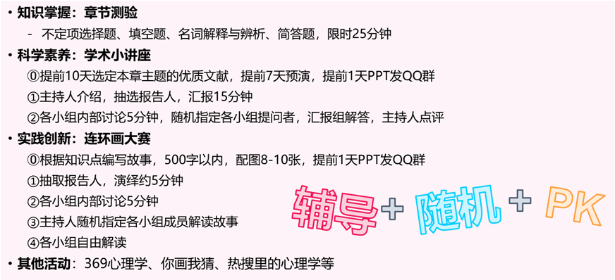 传统线下教学时知识点易错过,学习效率低;知识点讲解占满了课堂时间,科学素养与实践创新的课堂活动较少,学生对“心理学是一门科学”和“生活中处处都有心理学”缺乏切身体会。同时,线上教学也面临专业课性质的《普通心理学》慕课缺乏,学习过程难以监督等不足。因此,课程采用了混合教学形式以解决上述教学痛点。